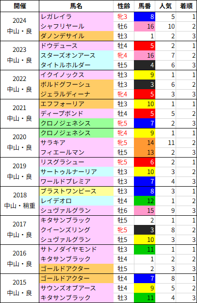真ん中から内寄りに優勝馬が多く、馬番12番以降は(0-4-2-44)。8枠は不利なレースですが昨年のシャフリヤール、一昨年のスターズオンアースが2年連続で16番枠から2着に入っており、過去10年では1~16番まで全ての馬番が1回以上3着以内に入っています。