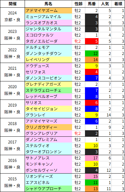 阪神開催での過去9年は全て良馬場で行われていたため道悪だと傾向は変わるかもしれませんが、レース傾向からは「1桁馬番が中心・2桁馬番は人気馬のみ」。