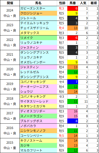 1~2枠・6~7枠と内外離れた枠からの好走馬がやや多めですが、近年は内の1~3枠に好走馬が多く4枠以降は2着まで。直近4年間の優勝馬の馬番は⑥③⑥④です。