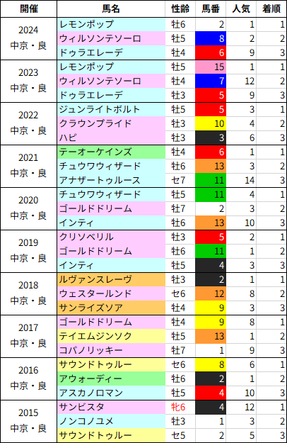 1~3枠の複勝率がやや高く、優勝馬も過去10年で6頭輩出しています。外枠から好走しているのはGⅠ実績がある5歳以上馬に多く、3~4歳は6~8枠に入ると(0-0-0-23)。また馬番だと14~16番は(1-0-0-25)。優勝したのは2023年1番人気のレモンポップです。