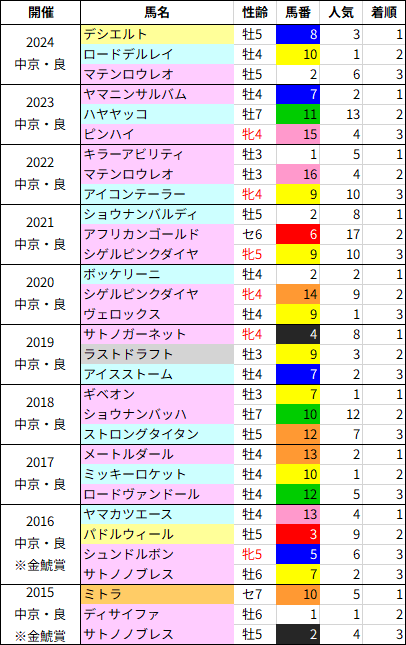 前走大敗からの巻き返しが多いレースですが、前走リステッドで2着以内だった馬が(3-2-1-4)。昨年1着のデシエルト・2着のロードデルレイ。一昨年は1着ヤマニンサルバム・3着ピンハイと近年好走馬が多いローテです。