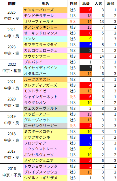 後のスプリンターを多く輩出しているレースだけに馬格が重要です。こちらも460kg未満で好走した4頭中3頭はグレナディアガーズ、ハッピーアワー、リリーフィールドと父or母父がノーザンダンサー系。残る1頭は2018年のフロンティアで新潟2歳Sの優勝馬でした。