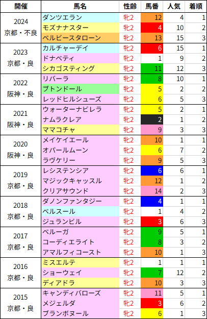 今年は例年に比べて前走1着馬の登録は多くありませんが、過去10年中9年で前走1着馬が優勝しています。また9勝中前走が新馬・未勝利戦だった馬が7勝・前走が1200mまたは1600mだった馬が7勝を挙げています。