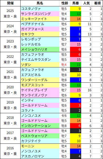 優勝馬の父を見ると過去10年ではミスプロ系が7勝を挙げています。近年ミスプロ系以外で優勝したのは2020年のモズアスコット、その前は2017年ゴールドドリーム・2016年モーニンと全体的に古い年。穴でもペプチドナイルが優勝するなど、頭を狙うならミスプロ系です。