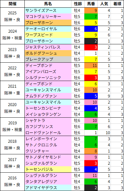 過去10年のうち6年は10~11頭立て、残りの4年は13~15頭立てと小頭数になりやすいレースです。枠順では4~6枠の複勝率がやや高く、馬番では6~11番くらいに好走馬が多いのが特徴です。