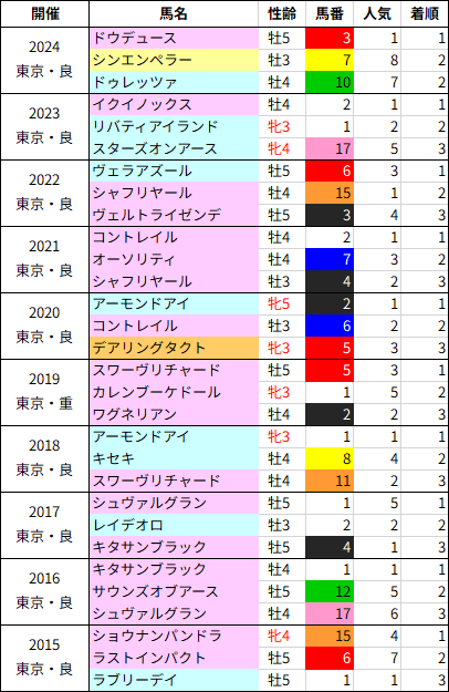 Cコース替わり2週目で内の状態が良く、近年はかなり内有利なレース。馬番1番が(3-2-1-4)・2番が(3-1-1-5)と馬番1~2番だけで過去10年中6勝を挙げています。 また5番人気以内×1~3枠は(9-3-6-6)・4~8枠は(1-5-2-18)と人気馬でも外枠では2着止まりが多く、最後に外枠で優勝したのは2015年のショウナンパンドラ。