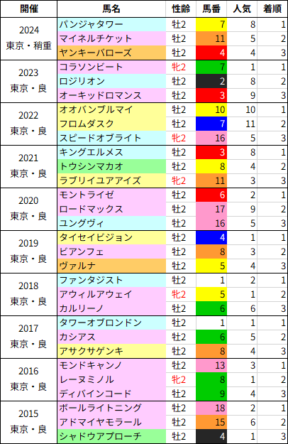 東京で行われるアルテミスSやサウジアラビアRCなど、この時期の2歳重賞では新馬・未勝利戦上がりの馬が活躍しているレースが多いのですが、京王杯2歳Sはオープンクラスで走ってきた馬の成績が良いのが特徴です。