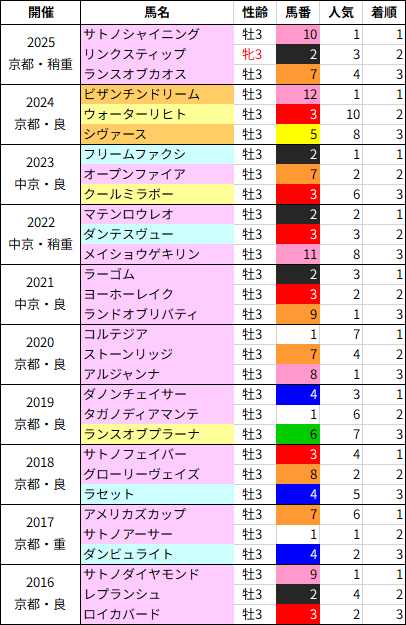 2016年のサトノダイヤモンド以降3着以内に入った馬からクラシック馬は出ていませんが、マイルで結果を残したウォーターリヒト、天皇賞・春で2着に入ったビザンチンドリーム、ダート路線に進んだフリームファクシ・クールミラボーなど古馬になってから様々な路線で活躍している馬が多いのが特徴です。
