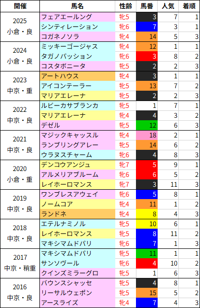 牝馬同士のハンデ戦になり前走クラスは不問。前走が条件戦だった馬は52kg以下のハンデだと(1-2-0-30)・53kg以上は(2-1-3-9)なので軽すぎる馬よりは少し背負っている馬の方が複勝率が高いのが特徴です。