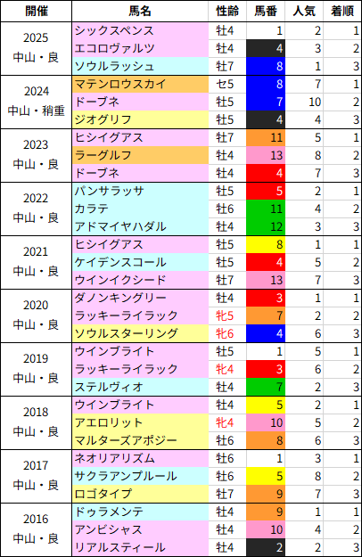 開幕週に行われるレースのため前に行った馬が残りやすく、前走4角9番手以下だった馬はほぼ全滅しています。人気馬はそれほど多くはありませんが、ソールオリエンス、ペルシアンナイト、アンビシャスと1番人気3頭もこのデータを覆せずに4着以下に敗れています。