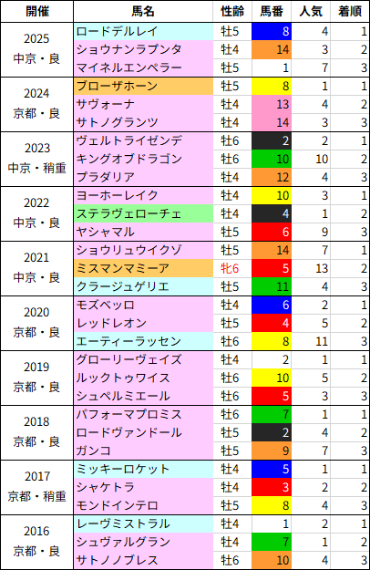 京都開催時は真ん中から内寄りの複勝率が若干高く、馬番では9~16番は(0-2-3-29)で2着まで。またこの5頭はガンコ(母父シングスピール)、ルックトゥワイス(母父アルザオ)、サトノノブレス(母父トニービン)、サヴォーナ(母父スニッツェル)、サトノグランツ(母父オラトリオ)で5頭中4頭が母父ノーザンダンサー系、また同じく5頭中4頭が母父欧州型でした。