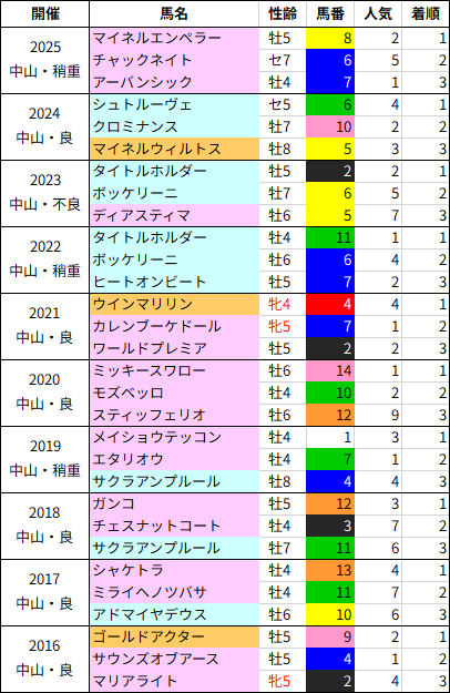 特に過去10年の3着馬は全て前走が中山の重賞だった馬なので、3着固定の3連単のような買い方も面白そうです。前走中山の重賞だった馬は誕生月でも偏りがあり、2月生まれが(3-1-4-8)・3月生まれが(0-0-5-9)と3着以内の大半を占めます。4月生まれは(0-5-0-13)と2着が多く、5月生まれは(2-1-0-4)。