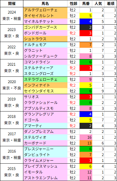 前走新潟・中京だった馬は2~3着にはよく入っていますが1着には届かず、また前走中山だった馬は過去10年では25頭全てが4着以下に敗れています。