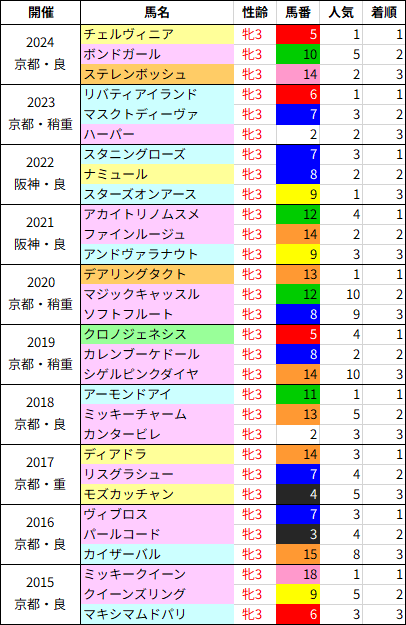 6番人気以下で3着に入ったのは5頭いますが春の時点で重賞好走の実績を持つ馬が多く重賞初挑戦だったのはソフトフルートのみ。カイザーバルも2歳時にアルテミスSで2番人気に支持されていました。
