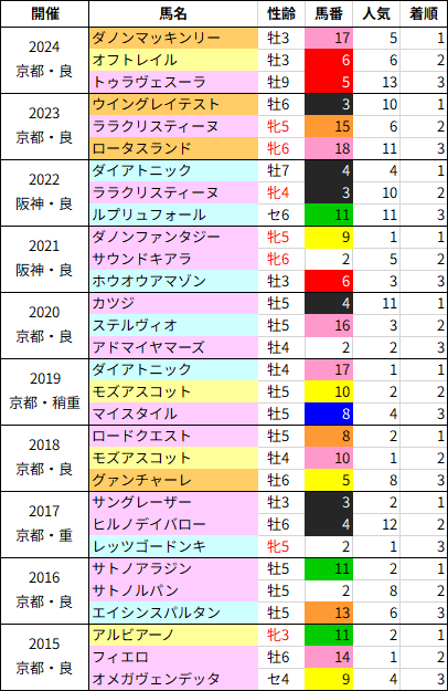 逃げ・先行馬よりも差し・追い込みが届きやすく昨年の1~3着馬も4コーナーでは10番手以下でした。先行馬で馬券に絡んでいるのは1400mの重賞勝ち馬・または1600mで実績がある馬が多く、1200mを専門としている馬は苦戦しています。