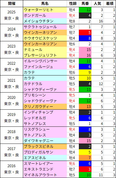 今年は4歳馬が少ないため、例年よりも内枠(1~4枠)に入った馬を重視・または軸にする買い方が良さそうです。5枠以降は相手・押さえまでが無難でしょう。