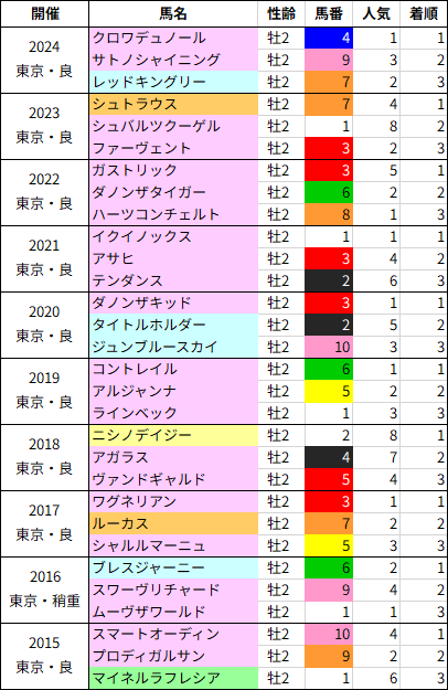 Cコース替わり週に開催されることが多く内枠有利なレースです。外枠でもそれほど不利には見えませんが、小頭数になる年も多く馬番だと8番以降は(1-3-2-28)。