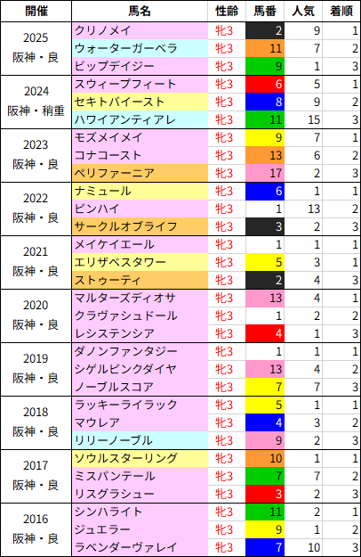同じ阪神芝1600mで行われる阪神JFからのローテが中心です。阪神JFで4着以内だった馬は(6-1-5-5)・また上がり5位以内だった馬も(6-1-5-4)と基本的には差し寄りで上がりを使えていた馬から。近年はエルフィンSや紅梅Sなどリステッドを使ってきた馬の好走も増えています。